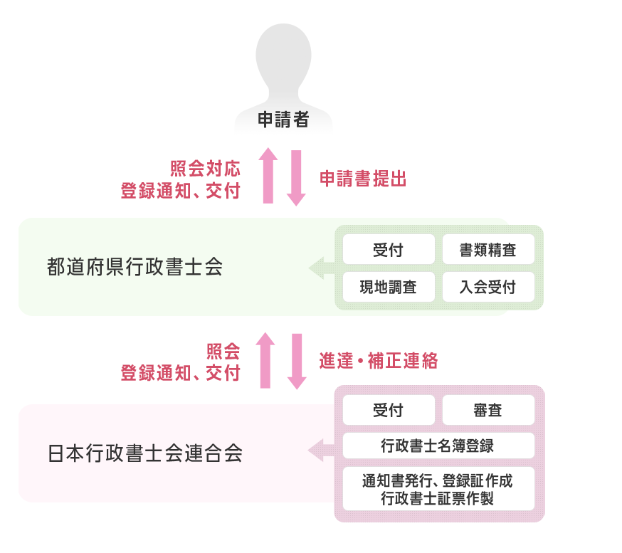 審査は、所属する都道府県の行政書士会と日本行政書士会連合会(日行連)によって段階的に進められます。